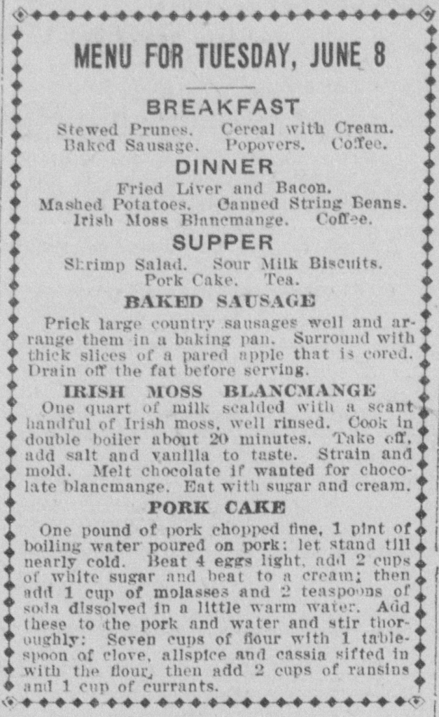 Menu for Tuesday, June 8 1920 Posted byJenniferJune 8, 2020June 7, 2020Posted inFull MenuTags:1920, breakfast, dinner, irish moss blancmange, june, pork cake, supper, tuesday Share this: Click to share on X (Opens in new window) X Click to share on Facebook (Opens in new window) Facebook Like Loading... Related